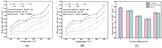The total wear rate of each specimen at different temperatures is shown in Figure 7c. The total wear rate of the brake friction material shows a tendency to decrease and then increase with the increase in fiber content. The specimens with 6 wt.% addition of plant fibers had the smallest wear rate. As a result of the addition of 6 wt.% fibers, the wear rate of the brake friction materials can be reduced by 38.2%. Therefore, the addition of plant fibers improves the wear resistance of these materials.