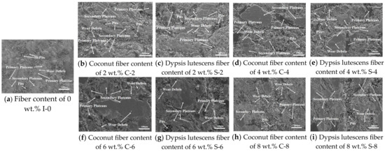 Compared with the I-0 specimens without added fibers, the wear surfaces of the other brake friction material specimens were relatively smooth, exhibiting fewer flaking pits and wear debris. This improvement is primarily attributed to the addition of plant fibers, which enhanced the bonding between the components and produced a mechanical self-locking with the base material, resulting in the improvement of the brake friction material’s strength and tribological properties [58]. A comparison of Figure 8b–g indicates that the wear of the brake friction material specimens gradually decreases as the fiber content increases. The wear surfaces of the C-6 and S-6 brake friction material specimens were the smoothest, with more secondary contact plateaus and relatively few abrasive chips and hard particles, which is consistent with the lowest wear rate data for this brake friction material. However, when the fiber content was too high (Figure 8h,i), a certain amount of abrasive debris and hard particles appeared, and scratches and spalling pits appeared along the friction direction. This is primarily because the high content of fibers reduces the bonding effect of the phenolic resin binder, which reduces the strength of the entire brake friction material, and is susceptible to fracture or detachment at high temperatures and under the action of shear forces [51,59].