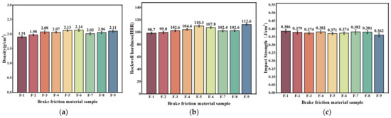 (a) The density of friction specimens with mixed plant fibers; (b) the hardness of friction specimens with mixed plant fibers; (c) the impact resistance of friction specimens with mixed plant fibers.
