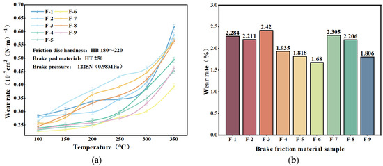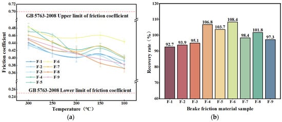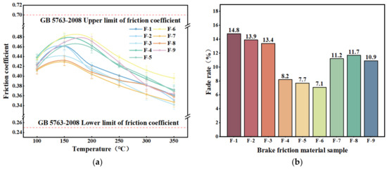 A graph of the friction factor variation with temperature for nine specimens of hybrid fiber-reinforced brake friction material during the fading (warming) test phase is presented in Figure 10. It is evident from Figure 10a that as the test temperature rises, the specimens’ friction factor first increases and subsequently decreases. The test results of the brake friction material specimens supplemented with dypsis lutescens and coconut fibers in the preceding section are comparable to this trend. The fiber content increased during the test, improving the scraping action between the brake friction material specimen and the friction disc, which caused the increase in friction factor. Initially, the friction disc and the brake friction material specimen did not match optimally. The subsequent reduction in the friction factor may be due to the thermal decomposition of the phenolic resin binder and the carbonization of the plant fibers in the brake friction material specimens during high-temperature operation, resulting in some lubrication of the friction surfaces [59,63]. Compared to other brake friction material specimens, the F-6 specimen has the largest friction factor and the least amount of temperature variation in its friction factor. The F-6 brake friction material specimen has a higher fading friction factor when compared to the specimen with the best heat degradation performance in the preceding section. Overall, the fade friction factors of the nine brake friction material specimens conform to the national standard GB 5763-2008 [35].