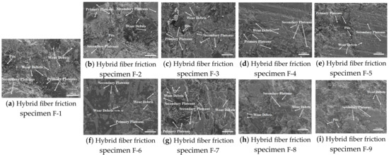 The wear surface micromorphology (SEM) of nine specimens of hybrid plant fiber-reinforced brake friction material is displayed in Figure 13. The wear surfaces of the F-1, F-2, F-3, F-7, and F-8 brake friction material specimens with higher fiber content were rougher, exhibiting more furrows, microcracks, and wear debris. These specimens also had secondary plateaus and showed broken fibers and pits, particularly on the F-1 and F-2 specimens. This is primarily due to the high content of plant fibers, which leads to the formation of hard particles, such as broken fibers, at the friction interface between the material matrix and the brake disc. These particles exacerbate both abrasive and adhesive wear of the brake friction material [54,56].