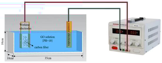 The schematic diagram of electrophoretic deposition is shown in Figure 2. The working electrode used a copper box, which was filled with CF. Utility tools were used to drill two holes on both sides of the copper box, and a filter was placed in the holes to ensure that CF cannot leak out of the copper box when the CF was in full contact with the GO electrolyte. The counter electrode was a copper plate, with the distance between the two being fixed at 5 cm. An MP3030D type DC power (MAI SHENG Corporation, Suzhou, China) supply was used. The surface of commercial carbon fibers was coated with a layer of commercial sizing agent [28,29], which affects the wrapping of CF by GO. Therefore, the surface of CF should be treated before modification. NaOH solution was added to the GO solution; the test was carried out under constant temperature, the voltage of the DC regulated power supply was adjusted to 15 v, the pH value of the GO electrolyte was adjusted to 10.0, the concentration was 1.5 mg/mL, and the modification time was 40 min. After deposition, the modified CF was rinsed with deionized water and then dried naturally at room temperature to obtain the GO-modified CF (GO-CF).