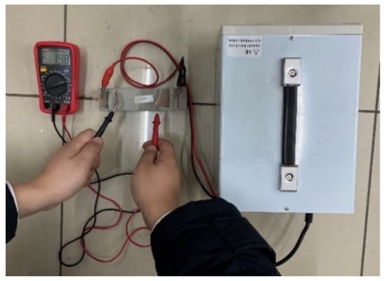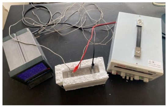A DC regulated power supply was used to apply a voltage of 30 V to both ends of the specimens, and the surface temperature of the specimens was collected by a paperless recorder at 90 s intervals, recorded for 15 min under constant power conditions. The specimens were placed in a freezer for refrigeration before the test, and the temperature of the specimens was lowered to 0 °C. In order to reduce heat loss, an experimental process was used to insulate the benzene board wrapped around the specimen. The experimental setup diagram is shown in Figure 5.