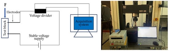 The schematic diagram of the pressure sensitivity test is shown in Figure 6. The test was carried out using a WDW-300 electronic universal testing machine. The upper and lower surfaces of the specimen were padded with insulating plates, and the voltage dividing resistor in the device was a 100 Ω constant value resistor. An MP3030D DC regulated power supply was used to supply power, and the power supply voltage was set to 20 V. According to the principle of series circuit voltage division, the resistance value R of the specimen to be tested can be calculated by Formula (3). During the test process, the stress change value and voltage change value of the voltage divider resistor were collected, and the resistance change rate was calculated according to Equation (4) at the end of the test.