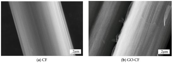 In order to determine the conversion of CF to GO-CF, SEM was used to analyze the morphological changes of both. As shown in Figure 7a, the surface micromorphology of deslurried CF is flat and smooth. Figure 7b shows the CF modified with GO; compared with the unmodified CF, the GO covers the CF surface, making the GO-CF surface rougher.