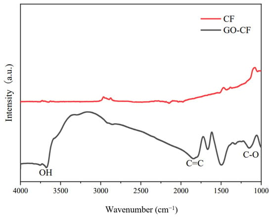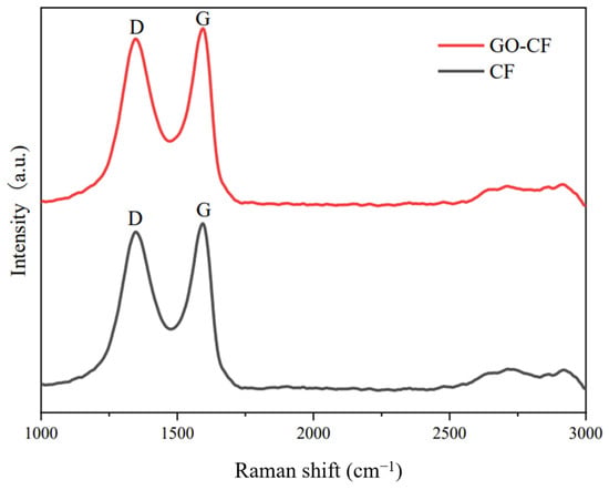 The Raman spectra of CF and GO-CF are shown in Figure 8. From the figure, it can be seen that there are two characteristic signal bands in the Raman spectra of both CF and GO-CF. The D band is the result of the induction of disordered structure, and the G band is the result of the induction of ordered structure. The intensity ratios of the D and G peaks, ID/IG, are generally used to illustrate the apparent conditions of carbonaceous materials [31]. The ID/IG values of GO-CF and CF were 0.87 and 0.82, respectively, indicating an increase in the disordered structure of the CF surface after GO modification, suggesting that the oxygen-containing functional groups carried by GO made the structure of the CF surface more disordered, thereby proving that GO had been successfully introduced into the CF surface.