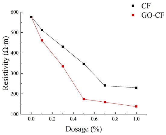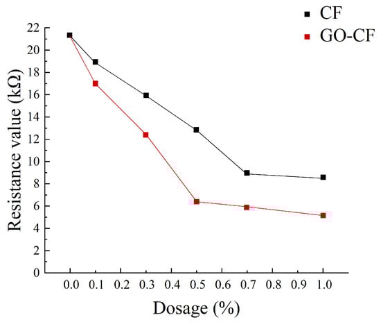 Figure 11 shows a graph of the measured resistance variation with fiber doping, and Figure 12 shows the resistivity variation of CF and GO-CF cementitious composites. As can be seen in Figure 11 and Figure 12, the resistivity of cementitious composites shows an overall decreasing trend with increasing CF doping. When CF doping was in the range of 0–0.3 wt%, the resistivity decreased significantly, by 25.35% compared to pure cement. When the CF doping was in the range of 0.3–0.7 wt%, the resistivity decreased sharply, and the percolation threshold was reached when the CF doping was 0.7 wt%. When the CF doping exceeded 0.7 wt%, the resistivity did not change significantly with the increase of fiber doping and basically became stable. The overall trend of resistivity change of GO-CF cementitious composites is the same as that of CF cementitious composites: with the increase of GO-CF doping, the resistivity decreases gradually and finally tends to be stable. However, it is obvious from the figure that the resistivity of GO-CF cementitious composites decreased more rapidly and to a greater extent. At the same time, the percolation threshold of GO-CF doping was reduced to 0.5 wt%, and when the GO-CF doping was 0.5 wt%, the resistivity saw a maximum decrease to 48.39%, which was 69.95% compared with pure cement.