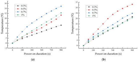 Figure 14 shows the variation of temperature with time for CF cementitious composites and GO-CF cementitious composites under energized conditions with different fiber dosages. From Figure 14a, it can be seen that the surface temperatures of CF cementitious specimens all increased with the increase of energization time. Comparing the four fiber dosages, when the CF dosage was 0.7%, the surface temperature of the specimen increased most rapidly and the temperature rise value was the largest, and the surface temperature of the specimen reached 14.89 °C when energized for 900 s.