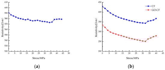 Figure 15 shows the resistivity curves of CF cement mortar specimens and GO-CF cement mortar specimens under stress with different fiber content. You can see from the picture that under monotonic loading, the resistivity of ordinary cement mortar specimens is almost unchanged, and only slight fluctuation occurs. The resistivity change is poor in regularity, and there is no rule to follow; when doped with CF/GO-CF, the resistance of cement mortar specimens with different fiber contents decreases first and then increases with the increase of applied stress, and the resistivity decreases rapidly in the early stage of stress application.
