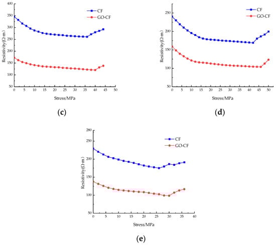 The resistivity curve of CF/GO-CF cement mortar specimens varies with stress. (a) PC; (b) 0.3%CF/GO-CF; (c) 0.5%CF/GO-CF; (d) 0.7%CF/GO-CF; (e) 1%CF/GO-CF.