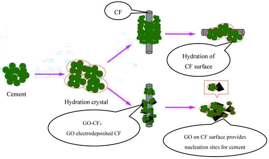 In Figure 17, the interaction with cement hydration crystals before and after CF modification is shown schematically. It can be clearly seen that due to the smooth surface of CF, there is a large void between the cement hydration crystals and CF surface, and the bonding performance between them is poor. On the other hand, on the surface of GO-CF hybrid fibers, GO provides nucleation sites for cement hydration crystals and has a regulatory effect on cement hydration products. The hydration crystals are aggregated and embedded in the GO surface, which improves the bonding performance at the interface of CF and the cement matrix, and also improves the dispersion of CF in the cement matrix, which gives the GO-CF cementitious composites good functionality.
