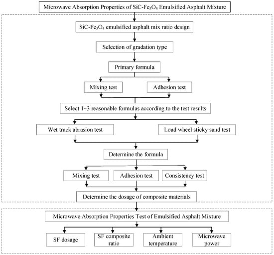 This article employs various methods such as theoretical research and indoor experiments to study the microwave absorption performance of the SiC-Fe3O4 emulsified asphalt mixture. The technical route is illustrated in Figure 1.