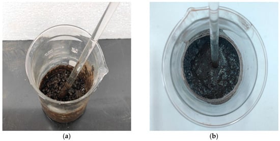 Mixing test. (a) The state when the mixture begins to thicken; (b) when there is too much water added.