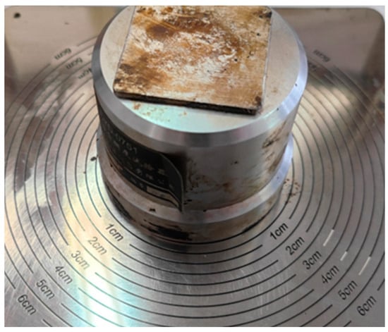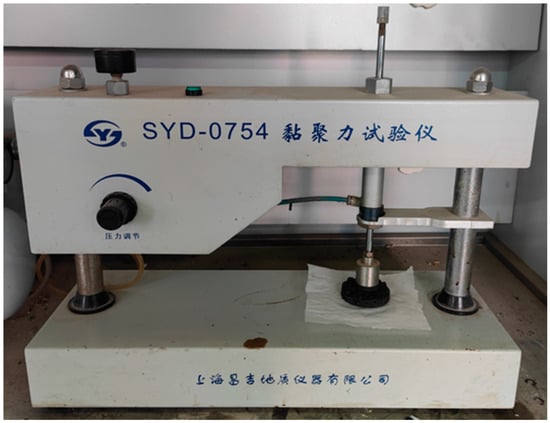 The cohesion tester (Changji Geological Instrument Co., Ltd., Shanghai, China) used in this study is shown in Figure 5. After determining the appropriate amount of added water for the emulsified asphalt mixture through mixing experiments, this amount was selected for the cohesion tests. A series of cohesion tests were conducted by fixing the quantities of other materials and only varying the amount of emulsified asphalt. The optimal amount of emulsified asphalt was selected based on the measured cohesion values and the failure state of the test specimens.