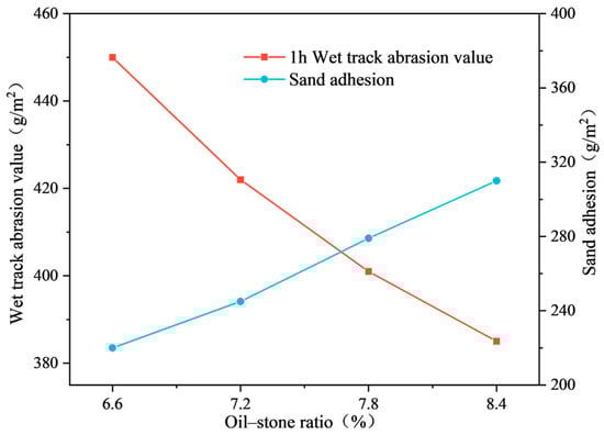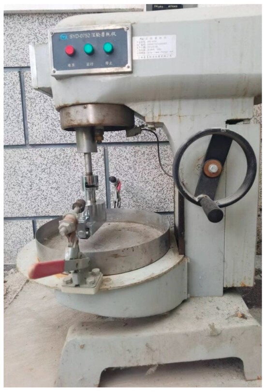The wet wheel abrasion tester (Changji Geological Instrument Co., Ltd., Shanghai, China) used in this study is shown in Figure 6. The steps for conducting the wet wheel wear test are as follows: