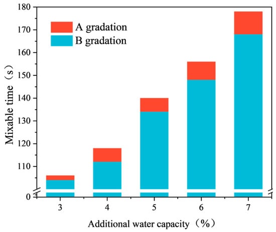The oil-to-stone ratio range specified in China’s standards for MS-3 micro-surfacing is 6.0% to 8.5% [22]. Calculated based on a 60% evaporation residue content, the corresponding emulsified asphalt range is 10% to 14.2%. Based on this range, the initial selection of emulsified asphalt dosage in the mixing test is 13%, corresponding to an oil-to-stone ratio of 7.8%. Cement, used as a filler, has a small dosage and a relatively minor impact on the mix design of the emulsified asphalt mixture; thus, a commonly used dosage of 1% is adopted. The particle sizes of the added SiC and Fe3O4 materials are both less than 0.075 mm. In the mix design process, the role of SF is similar to that of mineral powder, and their influence on the initial mix ratio is not considered. The amount of water added is determined according to the consistency of the mixture. Since the asphalt emulsion contains some water, based on existing experiments, when the amount of modified emulsified asphalt is 13%, the range of added water should be 3% to 7%.