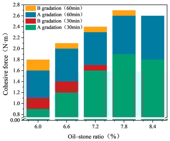 According to the Technical Guidelines for Micro-Surfacing and Slurry Seal [22] (hereinafter referred to as the “Guidelines”), the actual oil-to-stone ratio used for MS-3 grading is typically between 6.0% and 7.5% and should not exceed the specified limit of 8.5%. Therefore, based on a 60% evaporation residue content, the dosage range of modified emulsified asphalt was selected to be 10% to 14%, corresponding to an oil-to-stone ratio range of 6% to 8.4%. The dosage ratios of various materials used in the cohesion test are summarized in Table 8.