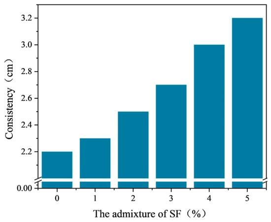 The consistency tester (Changji Geological Instrument Co., Ltd., Shanghai, China) used in this study is shown in Figure 8. The consistency test determines the consistency of the emulsified asphalt mixture, which can be affected by the addition of SF, altering the slurry state of the mixture. Both ASTM and ISSA specify that the viscosity of slurry mixtures should be within the range of 2–3 cm [22]. The viscosity of the emulsified asphalt mixtures with different mass fractions of SF is determined through viscosity tests, and the reasonable range of SF dosage is identified based on the viscosity specifications.
