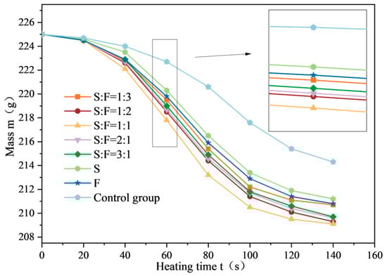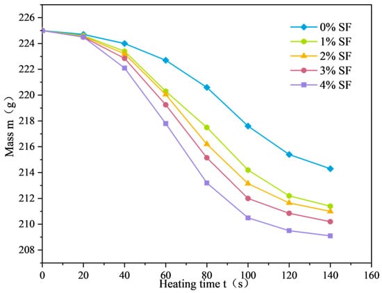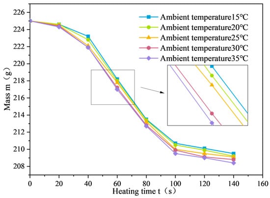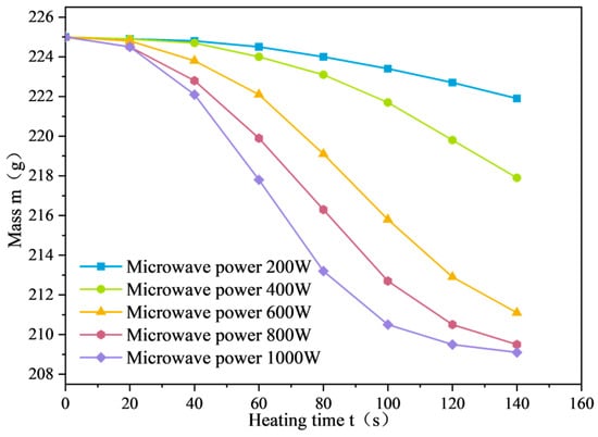 When the microwave power was 200 W, 400 W, 600 W, 800 W, and 1000 W, the mass change () of the specimens heated for 140 s was 3.1 g, 7.1 g, 13.9 g, 15.5 g, and 15.9 g, respectively. The quality change trend of emulsified asphalt mixture specimens heated for 140 s varies slightly under different powers: