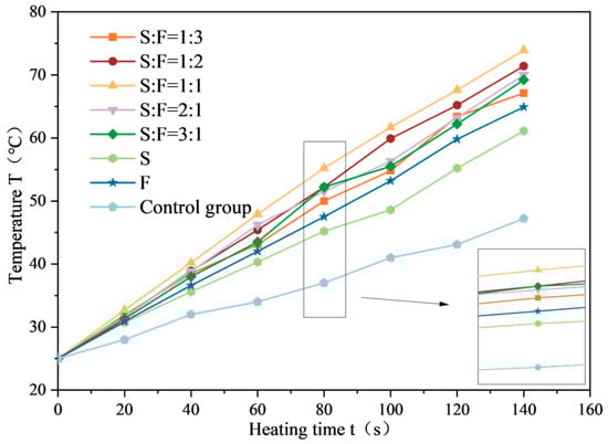 Temperature Stabilization Stage: At this stage, the temperature rises above 100 °C, reaching the boiling point of water. A large amount of water evaporates in the mixture system, and the evaporation of water takes away most of the heat. This leads to a relatively slow rate of temperature increase ().