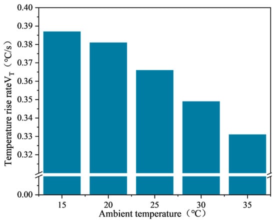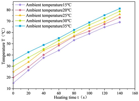 When the microwave power increases, the electric field strength (E) generated by electromagnetic waves also increases. According to Equations (12) and (13), assuming that the electric field generated by a microwave with a fixed frequency is a uniform electric field, and the distance between the resistance R and the electric field (d) remains constant, the square of the electric field strength (E) in the microwave is proportional to the microwave power P. Thus, it can be concluded that the absorption power () of the emulsified asphalt mixture specimen to microwaves is proportional to the microwave power (P). Based on the previous conclusions, it can also be concluded that the average temperature rise rate () of the specimen is roughly proportional to the microwave power (P), as shown in Equation (14).