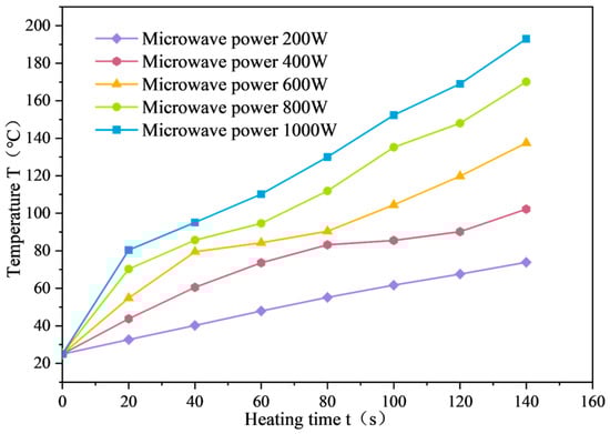 As the microwave power increases, the rate of temperature rise () of emulsified asphalt mixture specimens continues to increase. When the microwave power is 200 W, 400 W, 600 W, 800 W, and 1000 W, the temperature change () of the specimen heated for 140 s is 48.9 °C, 77.2 °C, 112.5 °C, 145.1 °C, and 168 °C, respectively.