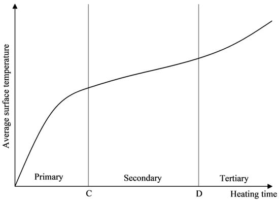 The average surface temperature variation curve of SF-EAM under microwave heating at different powers is shown in Figure 30. It can be seen that at an initial temperature of 25 °C, the surface temperature (T) of the emulsified asphalt mixture specimen mixed with 4% SF (S:F= 1:1) varies linearly with the heating time (t) when heated for 140 s at 200 W. When the microwave power is 400–1000 W, the temperature (T) and heating time (t) exhibit a nonlinear relationship. The surface temperature growth trend of the specimen can be divided into three stages. The time separation node between the first and second stages is denoted as node C, and the time separation node between the second and third stages is denoted as node D, as shown in Figure 31.