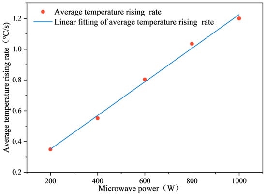 The relationship between the average temperature rise rate and microwave power is shown in Figure 32. According to Figure 32, the rate of average temperature rise is roughly proportional to microwave power. There are differences in the duration of the three stages of temperature changes in SF-EAM under different powers. As microwave power continues to increase, the rate of temperature rise () of emulsified asphalt mixture specimens in the three stages also increases. That is, the higher the microwave power, the shorter the duration of the first and second stages, and the earlier the C and D node times.