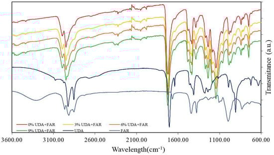 Fourier-transform infrared spectra of undecylenic acid (UDA), farnesol (FAR), poly(methyl methacrylate) (0% UDA+FAR), and composites with 3%, 6%, and 9% UDA+FAR.