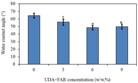 Water contact angle on the surface of the composites with 0%, 3%, 6%, and 9% of the total concentration of both antimicrobial compounds undecylenic acid (UDA) and farnesol (FAR). Asterisks above the columns show significant differences among the groups and compared to the controls (p < 0.05, Tukey’s test). The results are presented as means ± SDs.