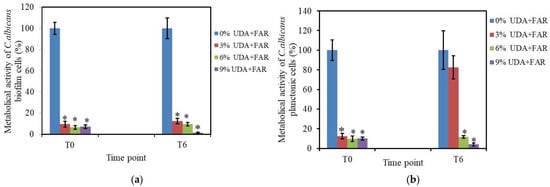 Comparison of a metabolically active Candida (C.) albicans biofilm (a) and planktonic (b) cells after incubation with poly(methyl methacrylate) (PMMA) modified with the combination of equal concentrations of tundecylenic acid (UDA) and farnesol (FAR) (0%, 3%, 6%, and 9% UDA+FAR in total) in two points: 0 days (T0) and 6 days (T6) after PMMA_UDA+FAR composite preparation. The asterisks denote significant differences (p < 0.05) compared to the PMMA control.