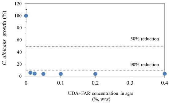 For better understanding the mode of action of the UDA+FAR combination, we employed two different assays to study the effect of “pure” UDA+FAR without PMMA on C. albicans’ growth. Firstly, the UDA+FAR combination was dispersed in an agar, and already at the lowest concentrations of UDA+FAR, 0.0125% in total (more precisely: 0.00625% UDA + 0.00625% FAR), the reduction of more than 90% C. albicans’ growth was obtained (Figure 4). This is very different from the results when those substances were tested separately [21,23]. Namely, it has been reported that UDA [21] or FAR [23] individually dispersed in an agar reduced 90% of C. albicans’ growth at the concentration of 0.0125%.