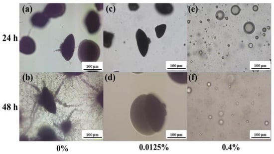 Alongside MIC detection, the effect of both substances on the C. albicans morphological changes was tested. In this test, we used agar embedded with the same minimum and maximum concentrations (0.0125 and 0.4% (w/w), respectively) of UDA and FAR as in the previously mentioned analysis. Briefly, a suspension made of 50 µL C. albicans cells with a concentration of 106 C. albicans cells/mL and 5 mL of YPD agar that contained different concentrations of UDA and FAR was poured into a 50 mL Polystyrene Conical Tube (Sarstedt 352073); afterwards, this suspension was poured into Petri dishes (Ø 30 mm) and incubated at 37 °C for 24 h and 48 h [21,23].