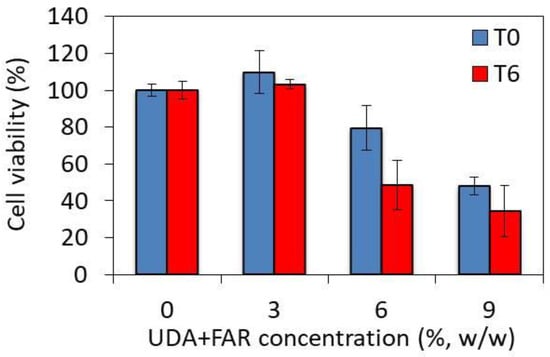 Both UDA and FAR are used as antifungal agents to prevent biofilm formation. In order to be used for medical purposes, low toxicity of the UDA+FAR composite to human cells must be demonstrated. We therefore performed a preliminary toxicity evaluation and studied the viability of human A549 cells seeded on the composites incorporating different UDA+FAR concentrations using the MTS viability assay at two time points. At T0, i.e., right after the preparation of the composite, the cell viabilities measured for the UDA+FAR concentration of 3% and for the composite without UDA+FAR were the same (Figure 6). At a concentration of 9% of UDA+FAR, a drop in cell viability of 52% was observed. At T6, 6 days after the preparation of the composites, no decrease in cell viability was observed for 3% of UDA+FAR, while the cell viability significantly dropped for the UDA+FAR concentrations above 3%. Based on these preliminary toxicity results, the composite loaded with the UDA+FAR concentrations of up to 3% is promising for medical applications.