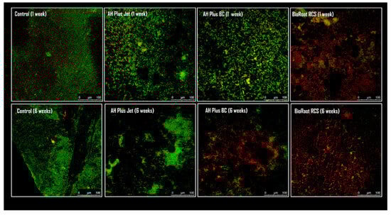 - Alsubait, S.; Albader, S.; Alajlan, N.; Alkhunaini, N.; Niazy, A.; Almahdy, A. Comparison of the antibacterial activity of calcium silicate- and epoxy resin-based endodontic sealers against Enterococcus faecalis biofilms: A confocal laser-scanning microscopy analysis. Odontology 2019, 107, 513–520. [Google Scholar] [CrossRef] [PubMed]