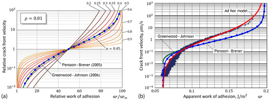 An evident weakness of the analytical relations (1) and (2) is that they are stiff, in the sense that, while both the general Greenwood–Johnson [23] and Persson–Brener [25] models are potentially flexible, their specific realizations lack adjustability to handle diverse rate-dependent adhesion data. This is because both Formulas (1) and (2) originate from a three-parameter standard solid model. In the case of adhesion, the meaning of the parameter is determined by the limit as . In other words, in contrast to the Gent–Schultz law (3), both Formulas (1) and (2) predict that the ratio belongs to the interval for any non-zero contact front velocity.