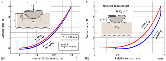 Figure 4a shows a typical force–indentation curve, which consists of two branches (loading and unloading). The corresponding relation between the contact force and the contact radius is shown in Figure 4b. The use of the relative contact radius reveals the fact that the classical JKR theory cannot be applied to the stiffness analysis over the entire range of indentation depths due to the significant influence of the thickness effect near the maximum indentation.