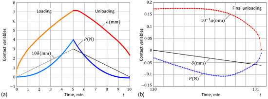 Variation in the contact variables with time (a) in the initial two-phase (loading/unloading) stage and (b) in the final unloading stage.