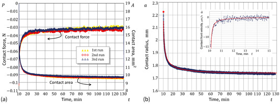 In Figure 6a, the dependencies of the contact area A and the normal contact force P on time t are shown for the resting stage at a nominal point contact (for the indentation depth ), where the contact exists solely due to adhesion (thus, the normal force P is negative here). Three consecutive indentation cycles were conducted in the experiment, which are depicted in the panels of Figure 6 with different colors. The time-dependent reduction in the contact area (or equivalently in the contact radius ) leads to a gradual decrease in the adhesive component of the contact force, and, as a result, a time-dependent increase in the measured normal force P.