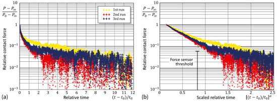 Observe that in many cases decay evolution may exhibit an exponential character, so that by plotting the time dependence using a logarithmic ordinate, the graph can be transformed into a straight line. Figure 7a and Figure 8a show that the exponential law is not adequate in the case under consideration. On the other hand, by additionally stretching the time coordinate (in the same way as that recovered in the analysis of the contact radius variable), we see from Figure 7b and Figure 8b that the stretched-exponential law works not only for the contact area (as could be expected) but also for the contact force. It is interesting to note here that, in the main, the equation holds up until the stage of ‘dynamic equilibrium’, where the contact force fluctuations are within the range of the force sensor threshold.