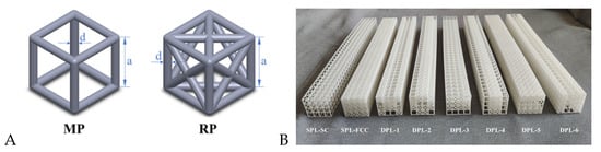 (A) Illustrations of the simple cube (SC) unit and the face-centered cube (FCC) unit. (B) The specimens of SPLs and DPLs fabricated by selective laser sintering.