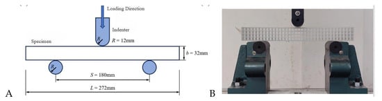 The experimental setup for the quasi-static bending loading test is shown in Figure 2. The radius R of the cylindrical indenter and supporting cylinder is 12 mm, and the span S is 180 mm. Two repeated experiments were conducted on each group of specimens. The experiment was conducted on a universal material testing machine with a range of 100 KN and a loading speed of 10 mm/min.