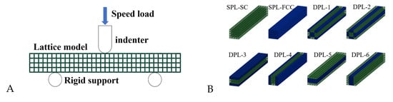 As shown in Figure 1A, the dual-phase lattice (DPL) structure consists of simple cubic (SC) units as the basic phase (BP) and face-centered cubic (FCC) units as the reinforcing phase (RP). The cross-section adopts 4 × 4 units, and the ratio of the number of matrix phase to reinforcement phase cells was set to 1:1 while maintaining the symmetry of the lattice structure. A total of 34 layers of cross-sectional units were arranged along the axial array to form an array structure beam. This article presents six types of biphasic lattice beam structures with identical geometric dimensions, named DPL 1-DPL 6. The diameter d of the column that constitutes the lattice unit is 1.5 mm, the side length a of the lattice unit is 8.0 mm, and the cross-sectional side length b of the beam-type lattice structure is 32 mm, with a total length of 272 mm. The actual structural models of DPL-3 and DPL-4, as well as DPL-5 and DPL-6, are the same but differ based on different vertical contact surfaces in the three-point bending load direction. In addition, two single-phase lattice structures were designed, namely the basic phase lattice structure formed solely by a simple cubic cell array (SPL-SC) and the enhanced phase lattice structure formed solely by a face-centered cubic cell array (SPL-FCC), as the control group. The size of the single-phase lattice structure beam formed is consistent with that of the dual-phase lattice structure beam mentioned above.
