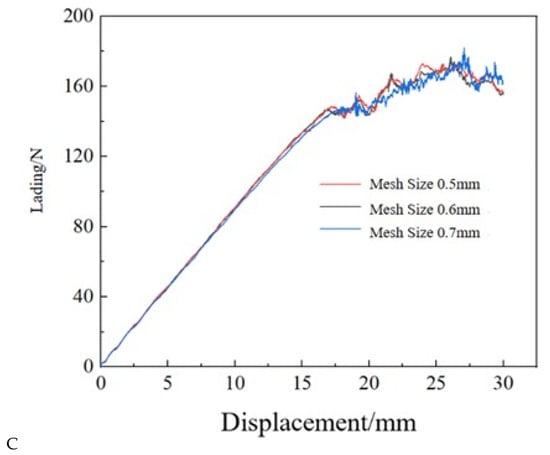 The nonlinear finite element software ABAQUS/Explicit (ABAQUS, Inc., Rising Sun Mills, Providence, RI, USA) was used to simulate quasi-static three-point bending experiments of single- and dual-phase lattice structure beams. All test samples were simulated and analyzed, and representative simulation models are shown in Figure 3A. Figure 3B presents the finite element model for lateral indentation tests of SPLs and DPLs, which facilitates the understanding of the dual-phase structure design, with the base phase (SC) represented in green and the reinforcing phase (FCC) in blue. The quadrilateral rigid shell element (R3D4) was used to model the pressure head and support, while the beam-type lattice structure was simulated using tetrahedral solid elements (C3D4). An elastic–plastic model was used to simulate the stress–strain constitutive relationship of the matrix material. In addition, universal contact was used to define the interaction between specimens and indenters, and specimens and supports. Two supports were set with completely fixed boundary conditions, and the pressure head was set with velocity boundary conditions. For quasi-static simulation, it is necessary to increase the loading speed to complete the calculation in a reasonable time. According to the criterion proposed by Santosa et al. [28], the loading speed increases linearly to 1 m/s within the first 10 ms and remains constant throughout the subsequent process. The stress cloud map of the lattice model and the reaction and displacement data of the indenter in the result file were extracted to generate the load–displacement curve for analysis. Mesh sensitivity studies were performed on single-phase lattice structures to select the appropriate mesh sizes. The finite element model was set with three different mesh sizes: 0.5, 0.6, and 0.7 mm. The load–displacement curves are shown in Figure 3C. The results indicate that a grid with a size of 0.6 mm can ensure sufficient computational accuracy. Therefore, the unit size of the numerical analysis model was set to 0.6 mm.