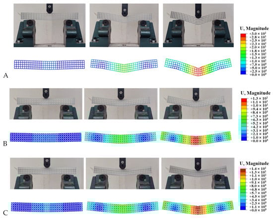The deformation mode of SPLs under three-point bending: (A) simulation results; (B) unloaded specimen after testing.