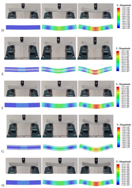 The deformation process of SPLs and DPLs under lateral loading experiments and numerical simulations. (A) SPL-SC beam. (B) SPL-FCC beam. (C) DPL-1 beam. (D) DPL-2 beam. (E) DPL-3 beam. (F) DPL-4 beam. (G) DPL-5 beam. (H) DPL-6 beam.