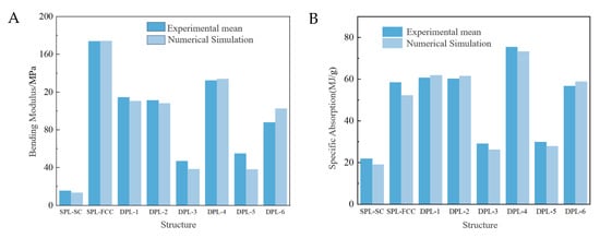Comparison of bending moduli of single-phase and dual-phase point array structures. (A) Experimental and numerical results of bending moduli. (B) Experimental and numerical results of specific absorption.