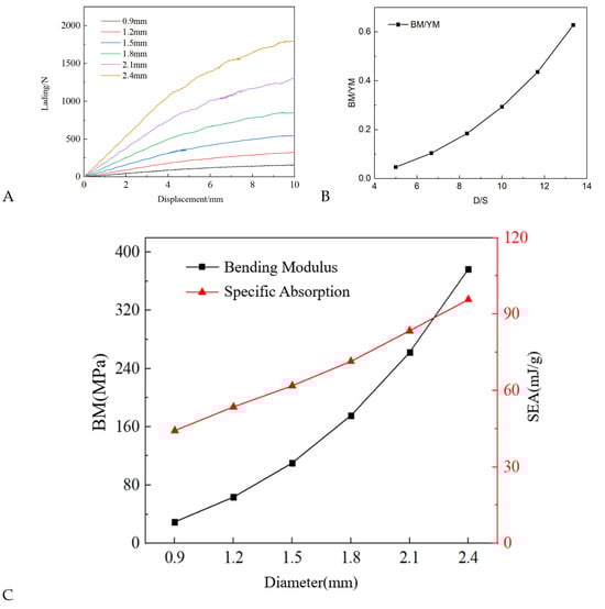 The bending modulus and specific energy absorption of the DPL-1 biphasic lattice structure with different rod diameters calculated based on the load–displacement curve are shown in Table 4, and the comparison between bending modulus and specific energy absorption is shown in Figure 9C. As the diameter of the rod increases, the bending modulus of the dual-phase lattice structure gradually increases, and the growth amplitude gradually increases. This means that increasing the relative density is an effective method to improve the bending stiffness of the lattice structure. In contrast, the improvement in pole diameter compared to the improvement in energy absorption performance is not so significant. As shown in Figure 8, the improvement in specific energy absorption is almost proportional to the increase in pole diameter. However, under the action of three-point bending, the biphasic lattice structure did not exhibit the phenomenon of specific energy absorption decreasing instead of increasing with the increase in truss pole diameter under compressive load. The reasons for this are twofold: firstly, the limited improvement in quality caused by an increase in relative density; secondly, the lack of a concept of densification strain under compressive load when compared through the same deformation displacement under bending load. An increase in relative density under compressive load will lead to a decrease in densification strain, thereby limiting energy absorption.