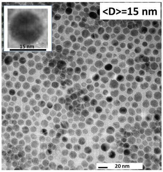Transmission Electron Microscopy (TEM) data measured on Fe3O4 nanoparticles yields an average diameter <D> = 15 nm. The inset shows the image of a single spherical particle from the ensemble.