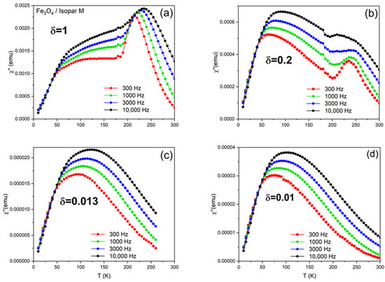 Temperature-resolved ac-susceptibility data measured at different frequencies spanning a three-order-of-magnitude range, 300 Hz (red), 1000 Hz (green), 3000 Hz (blue), and 10,000 Hz (black) on Fe3O4/Isopar M ferrofluids of different concentrations: (a) δ = 1, the as-prepared sample made of 10 mg of nanoparticles dispersed in 5 mL of carrier fluid, (b) δ = 0.2, (c) δ = 0.013, and (d) δ = 0.01.